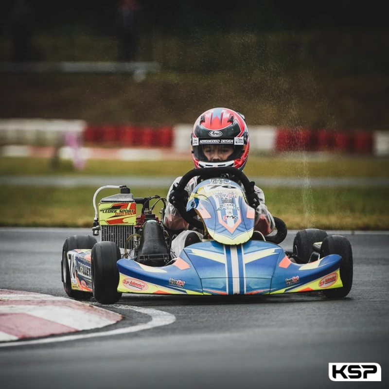 Les essais chronométrés du Championnat de France Cadet bénéficiaient de l’humidité de la piste de Lohéac après la pluie, ce qui ne manquait pas de charme en pneus slicks.