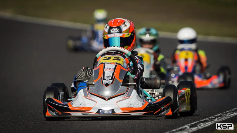 En tant que l’un des plus jeunes du plateau, Many Nuvolini (Formula K/Iame) a impressionné par sa capacité à rouler parmi les mailleurs pilotes Minime. Constant dans le top 3 derrière les deux favoris, il était là au bon moment quand un accrochage devant lui le consacrait Champion de France de manière précoce. Théo Battisti (Formula K/Iame) s’était montré très rapide en tête de la catégorie au 2e rang des manches et vainqueur de la préfinale. Il menait pendant la plus grande partie de la finale avant de se faire attaquer dans l’avant-dernier tour. Il tentait de répliquer dans le dernier tour, mais sa manœuvre audacieuse se terminait hors-piste avec son rival à quelques mètres de la ligne d’arrivée. Antoine Grisel (Kosmic/Iame) redressait la barre après une qualification difficile. 6 places regagnées dans les manches, 4 autres en préfinale et il partait 5e de la finale. Il réalisait le meilleur tour et montait sur la 2e marche du podium pour conclure un meeting positif. Lucas Bonhomme (Sodi/Rotax) avait bien commencé par le 5e chrono et une victoire en manche 1 avant de perdre du terrain au départ de la manche 3. Il réalisait une superbe finale en atteignant la 3e position avec un gain de 6 places à son actif. Jayden Soupiron (Formula K/Iame) était rentré dans le top des manches samedi soir. Malheureusement un incident en début de préfinale ruinait ses espoirs. Il regagnait courageusement 5 positions en finale pour intégrer le top 10. Andrea De Peretti poursuit avec beaucoup de sérieux son apprentissage en Minime au milieu de pilotes expérimentés. Il pouvait se féliciter d’avoir réussi à se qualifier pour les phases finales parmi les 63 participants.